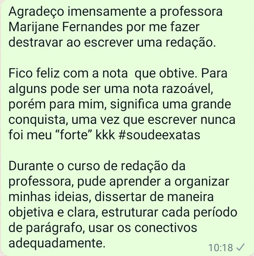 Para informar um pouco que seja sobre mim, já começo dizendo que priorizo o aprendizado do aluno e me esforço para que ele tenha o melhor sempre, uma vez que o sucesso do aluno está ligado ao meu sucesso, e meu sucesso está ligado aos milhares de alunos que conseguiram sua aprovação e uma excelente nota de redação por meio de meus ensinos.